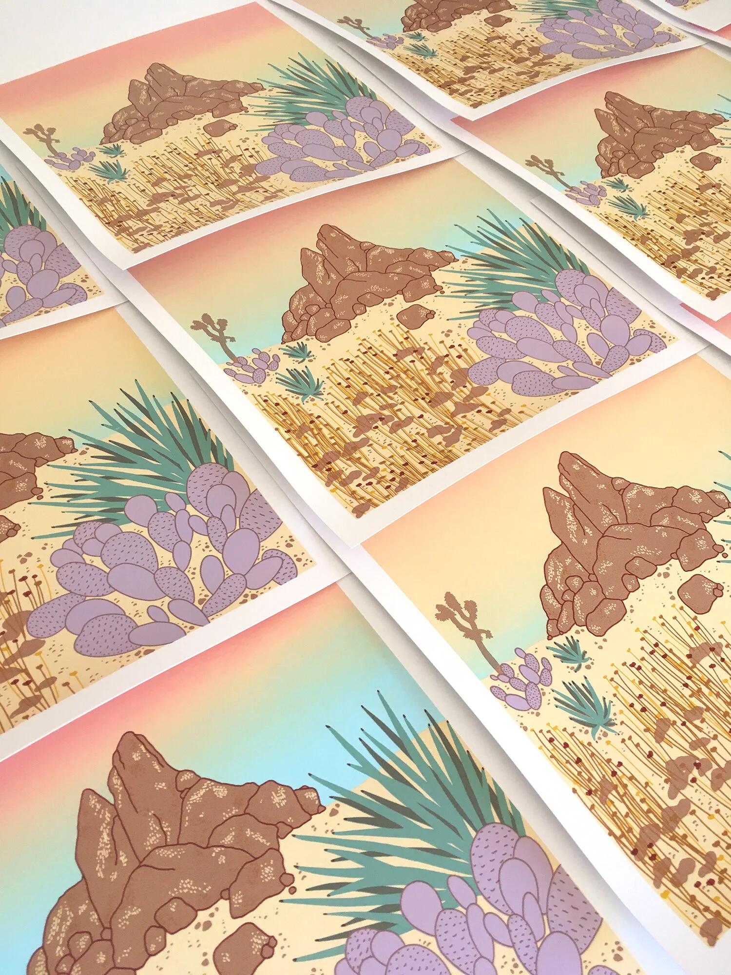 Screen print inspired by the landscaped cactus gardens found in Southern California.
